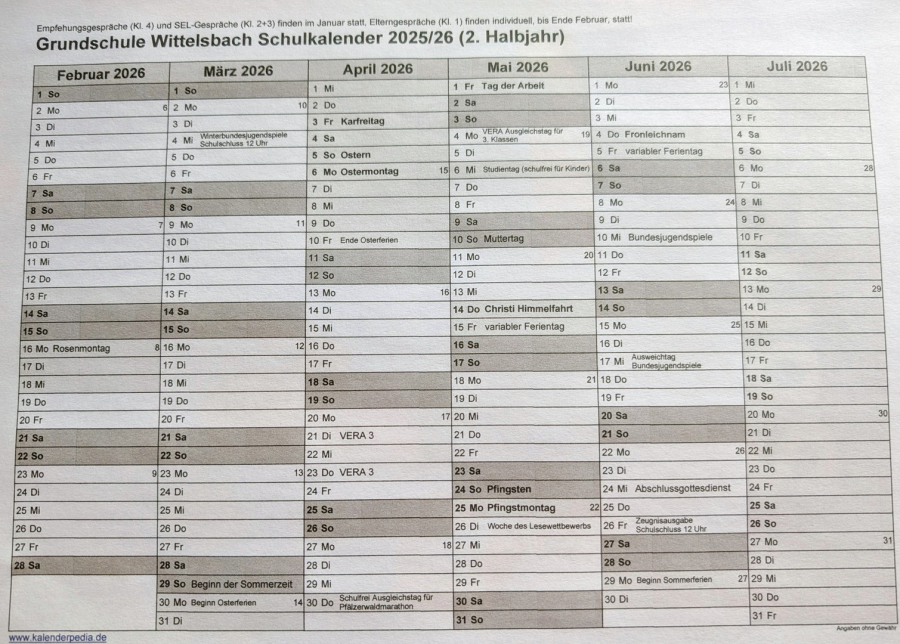 Der Terminplan für das aktuelle Schulhalbjahr: